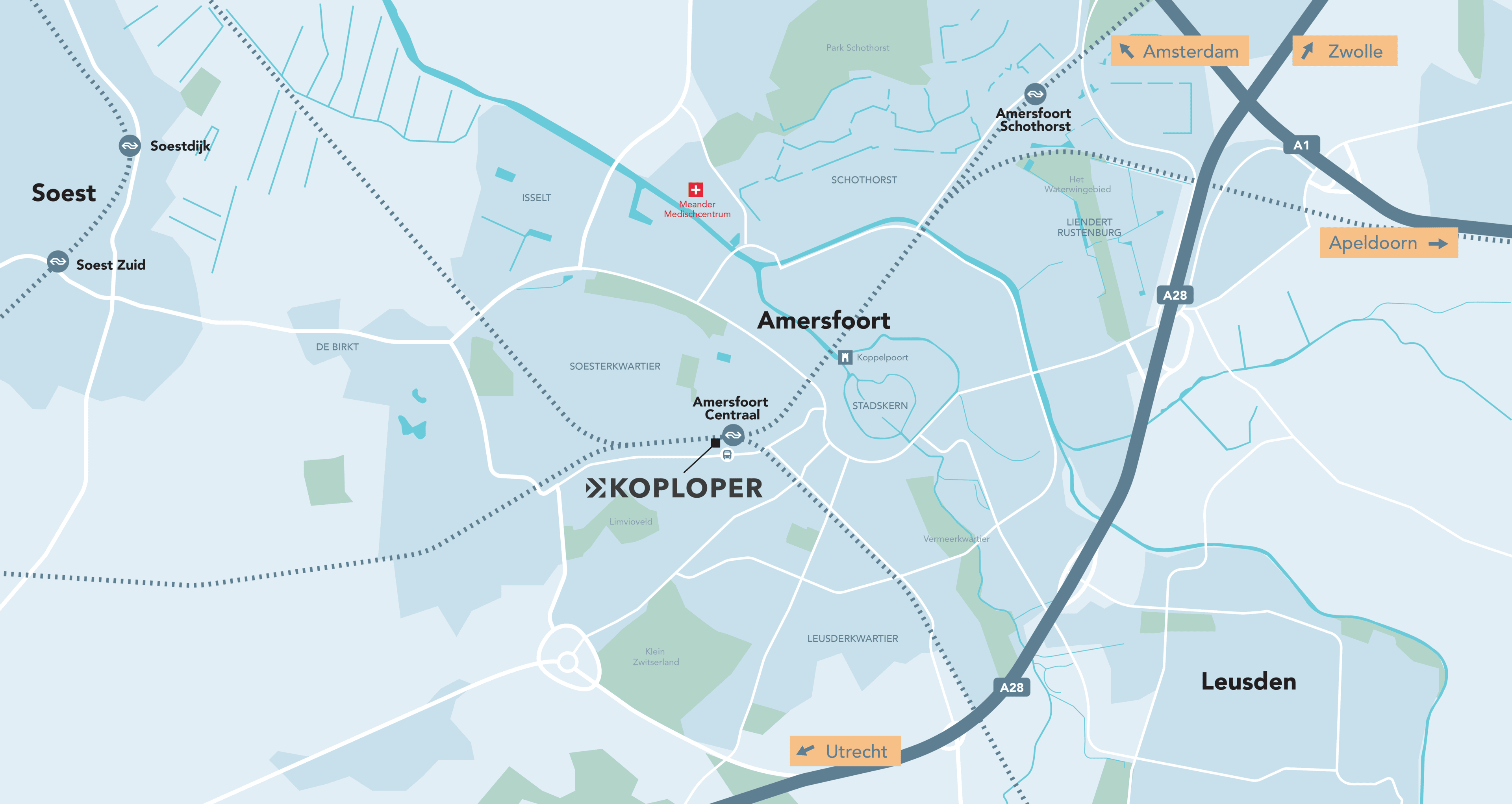 Kantoorgebouw de Koploper is van zeer hoge kwaliteit met een strategische ligging, centraal in Nederland en direct gelegen aan intercitystation Amersfoort Centraal, met snelle verbindingen naar onder andere Utrecht, Almere en Amsterdam. De bereikbaarheid met openbaar vervoer kan niet beter. Daarnaast ligt het kantoorgebouw op nog geen 10 minuten rijden van de A1 en de A28, en is het daardoor ook uitstekend bereikbaar met de auto. Voor de medewerkers op de fiets, is er een eigen fietsenstalling met laadvoorzieningen.